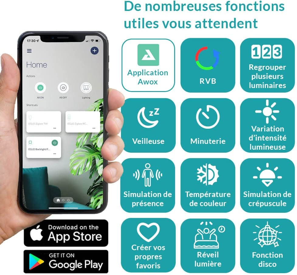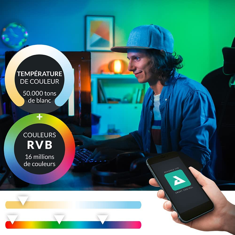 Functii: Control prin aplicatie smartphone, RGB, Modificare tip lumina ( calda, neutra, rece ), Intrerupator pedala